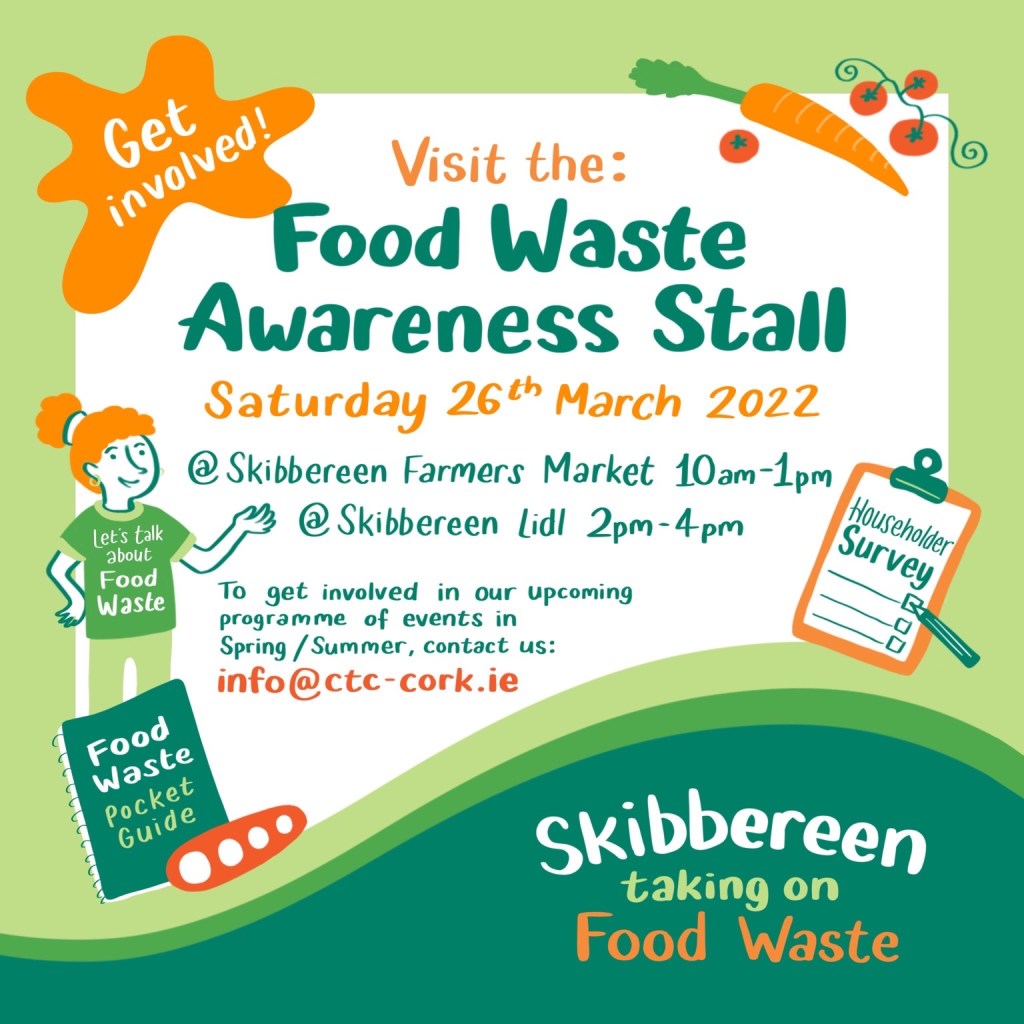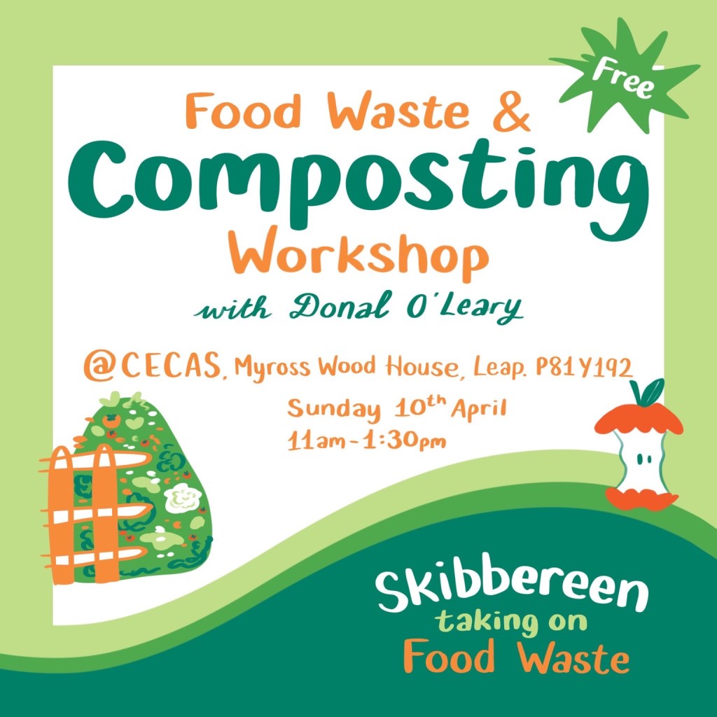 The first event in March involved food waste awareness stalls at Skibbereen Farmer’s Market and at Lidl. This was followed a couple of weeks later with a food waste and composting workshop at Myross Wood House courtesy of CECAS.