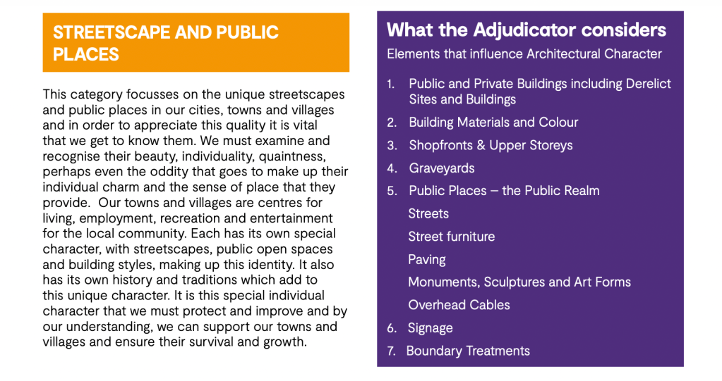 The highlight of the Tidy Towns year is the announcement of the national competition results at an event in Dublin to which representatives of medal-winning towns are invited. In 2021 this event was livestreamed for the first time, a great bonus for anyone interested in the results without having to travel to Dublin. This year the event was scheduled for the Friday of the October bank holiday weekend so perhaps not the best time for some to travel. This newsletter reflects on the work involved in each competition category during the judging year that ran from June 2021 to May 2022.